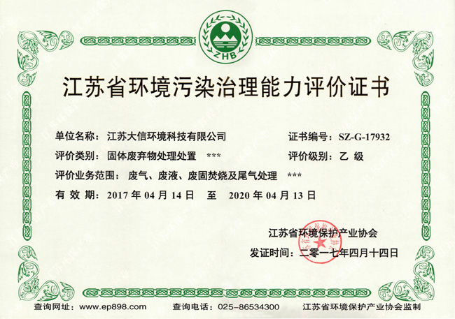 公司于2017年4月14日获得江苏省环境保护产业协会颁发的《江苏省污染治理能力评价证书》,评价类别与级别为:固体废弃物处理处置等乙级,有效期限为3年,从2017年4月14日至2020年4月13日。